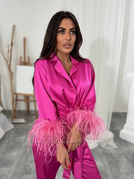 Костюм з пір’ям тільки на рукавах. Кофта на запах під пояс. Штани високої посадки на резинці, є кишені.Пір’я пришите❗️Можливий варіант з пір’ям на рукавах та штанах (ціна інша)