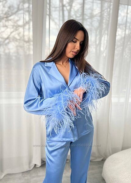 Кофта на запах під пояс. Штани високої посадки на резинці, є кишені. Пір’я пришитеПір’я на рукавах та штанах💙