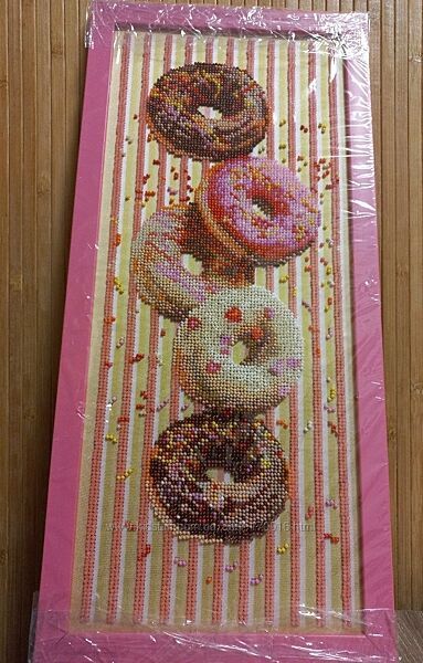 Продам картину "Пончики" вишиту бісером, ціна дуже приємна, ручна робота, розмір 15х37см, тканина сатин. Вже готова з рамкою і готова до відправлення. В живу виглядає неймовірно!Стане гарним подарунком для близьких і важливих вам людей.
