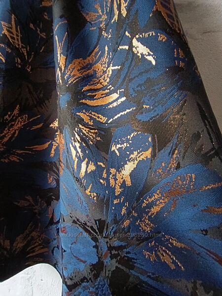 Крута, стильна спідниця міді, фірми Next, 14 розмір, стан ідеальний, по бокам дві кишені, тримає форму. На будь-яке свято. Темно синього кольору в абстрактні квіти типу соняшників чорно- золоті. Тканина парча.Додаткові заміри: напівобзват талії 40 см, довжина 82 см Пересилка за рахунок покупця.