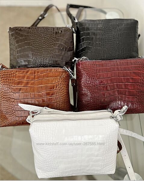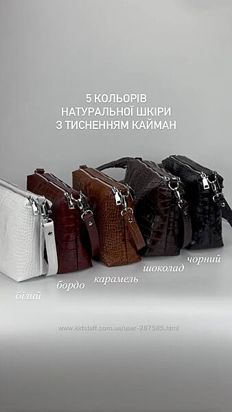 Увага: У шкірі з тисненням кайман представлена у 5 кольорах: чорний, шоколад, марсала, карамель, білий. Також сумочка доступна у 30 різноманітних кольорах шкіри флотар (гладенька, дрібнозерниста текстура), також можна виконати у замші або комбінація замші&шкіри!
