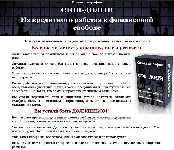 Не упустите шанс сделать первый шаг к финансовой свободе и принять участие в онлайн марафоне "Стоп-долги! Из кредитного рабства к финансовой свободе" под руководством Юлии Исмановой. Получите возможность изменить свою жизнь к лучшему и начать новую главу без долгов.