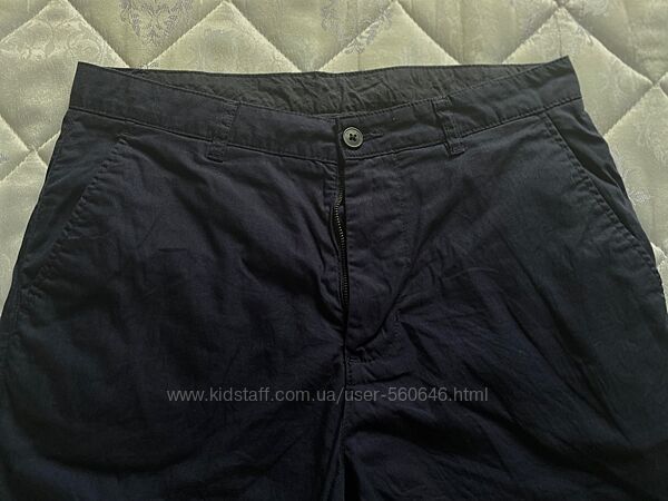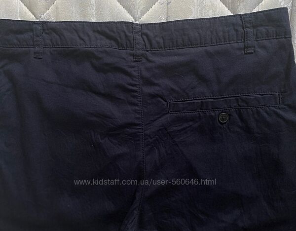 Шорти брючного крою з облегшеноі тканини. 100% бавовна. Застібуються на ґудзик і блискавку. Косі кишені попереду, ззаду 1 прорізна кишеня. Шльовки під ремень. Є запасні ґудзики. Бангладеш. Вказано розмір 32, дивіться виміри в спокійному стані. НапівОТ 43, напівОБ 55, посадка 30/41, довжина 48, ширина штанини вверху 32, внизу 25 см. Стан ідеальний, без дефектів. Колір темно-синій.