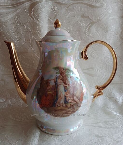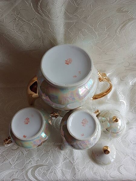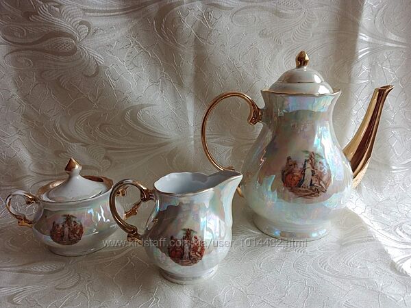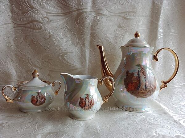 З одиниці з сервізу «Мадонна», - чайник – 1,2л, вершник – 300мл, цукорниця – 200г. Чайник майже ідеальний, єдине, - трохи стерта позолота по горловині. У вершника і цукорниці потерті ручки. В середині всі 3од. в стані нового. Без сколів і тріщин. Відправка НП.