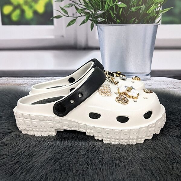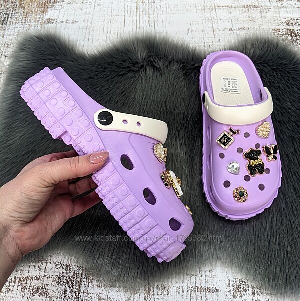 Женские пенковые кроксы на объемной подошве, с джибитсами. Стильная модель на платформеИзготовлены из EVA (пенка).Высота платформы 3 смПодойдут на узкую ногу или средней полноты
