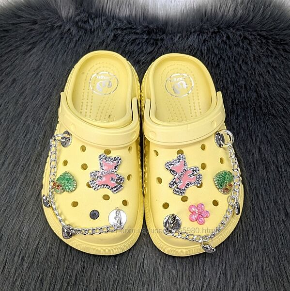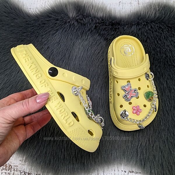 Нарядные кроксы для девочки, украшенные джибитсами и цепочками.Материал пена ЭВА. Отлично носятся, легко моются. Подойдут для прогулок, на море, в бассейн, да и вообще на все случаи жизни.Для выбора своего размера, смотрите размерную сетку на данную модель: (замеры внутри, от края до края)30р - 17,5 см