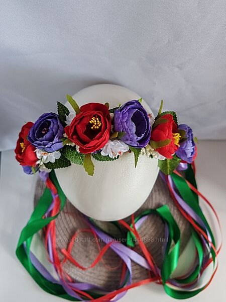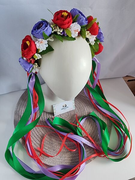 Гарний віночок під вишиванки, сукні. Підійде дівчатам в школу, садок так і дорослим. Стрічки знімаються. Основа металевий обруч. Без повернення. Доставку оплачує покупець