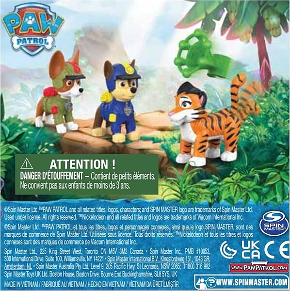ІГРАШКОВІ ФІГУРКИ ЧЕЙЗА ТА СЛЕДОДИЧА: Чейз і Слідопит мають зріст понад 5 см і виглядають так само, як із серії «ЩЕНЯЧИЙ ПАТРУЛЬ», одягнені в форму та шоломи «Цуценят джунглів».ЛАПУЧИЙ ТИГРИЙ ДРУГ: Коли настане час для захопливого порятунку, прикріпіть сітчастий снаряд до хвоста тигра та потягніть його назад у потрібне положення, а потім натисніть кнопку для запуску.