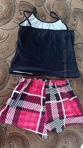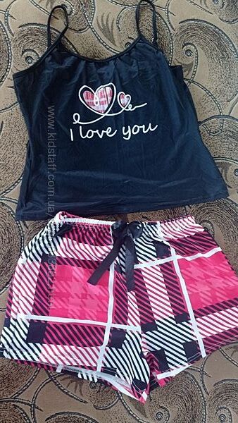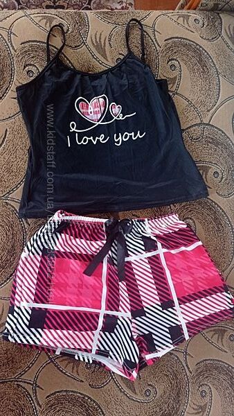 Склад: Поліестер-95%, Еластан-5%Піжамний комплект, що складається з майки та шортиків. Майка чорного кольору з спереду принтом, на тонких нерегульованих бретелях. Шорти у червоно-білу клітку, на широкій зручній гумці.