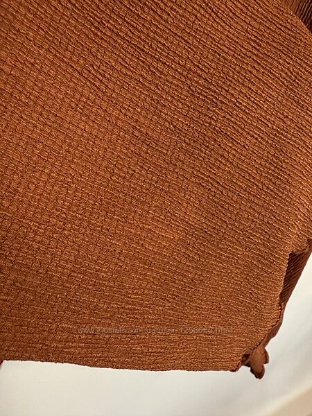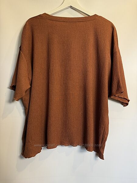 Тканина мʼяка, приємна на дотик, тягнеться. Крій вільний, прямий. Колір теракотовий. В наявності розмір L 44/46 євро.Заміри: плечі 62см, довжина рукава 18см, пів-обхват грудей 68см, довжина по спинці 57,5см.