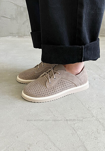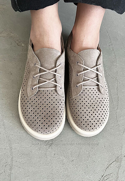 Замшевые женские туфли мокасины на шнурках летние дышащие с перфорацией бежевые.Верх: натуральная замша. Подкладка: натуральная кожа .