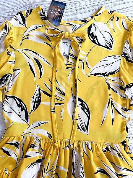 👗 Дизайн : Сукня жовтого кольору середньої довжини з ніжним квітковим принтом, пишна спідниця з рюшами.