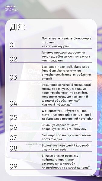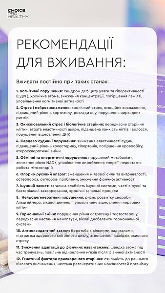 * NMN (160 мг): Підвищення енергії, омолодження, метаболізм, підтримка ДНК, довголіття.