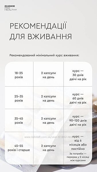 з 18 років — по 1 капсулі 2 рази на день до їди, запиваючи водою.
