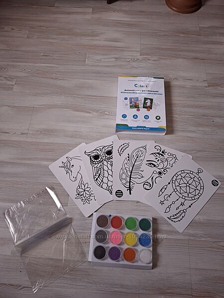Продам интересный, яркий, качественный набор для творчества: раскраски цветным песком Colorit. Комплектация: 5 авторских трафаретов формата А4, 12 баночек (по 40 г.) с песком разных цветов, большая коробка с отверстием, внутри которой удобно раскрашивать песком, кнопка-гвоздик, упаковка для готовых картинок. Набор, который открывает детям чудесный мир раскрашивания цветным песком. Высокое качество материалов, безопасных для детей. Такое творчество способствует развитию мелкой моторики рук, пространственное мышление и креативность. Набор станет прекрасным подарком для любого ребенка. Подарите своему ребенку возможность создавать яркие шедевры и наслаждаться процессом творчества. Цена: 700 грн.Набор новый, яркий, креативный, необычный, очень интересные картинки.