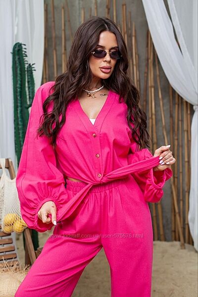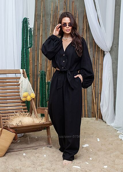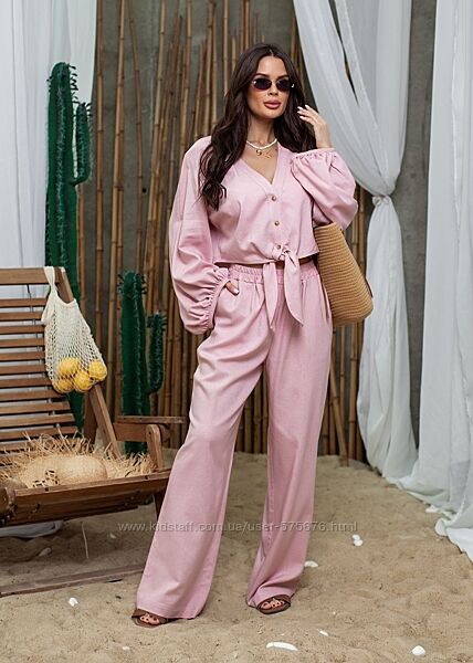 Подробное описание: 42-44, 46-48 Жіночий літній костюм із льону топ і брюки
