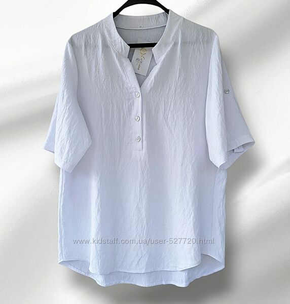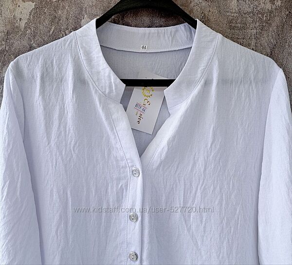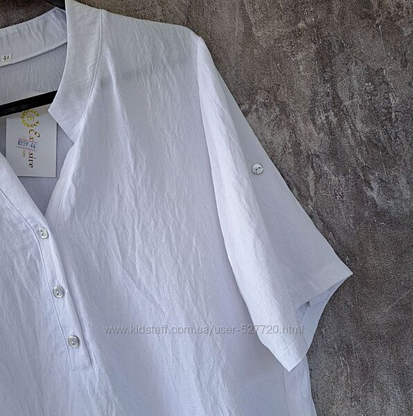 наявність уточнюйте будь ласкаЖіноча блузка сорочка прямого крою. V-подібний виріз, зверху застібка – планка з ґудзиками. Довжина рукава до ліктя, регулюється за допомогою хлястика з гудзиком.
