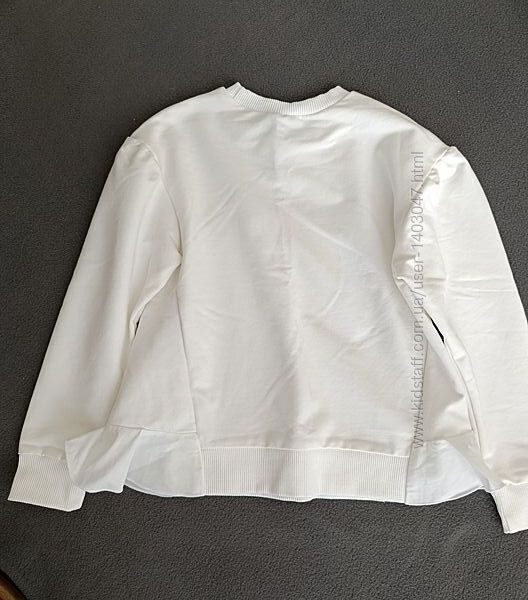 Стильний світшот для дівчинки 7-8 років, молочно білий колір, змішанна трикотажна тканина, ситцеві вставки по бокам в вигляді рюш, спущені плечі, ребриста резинка на рукавах, горловині і подолі.Розмір: 128