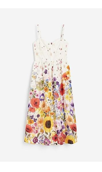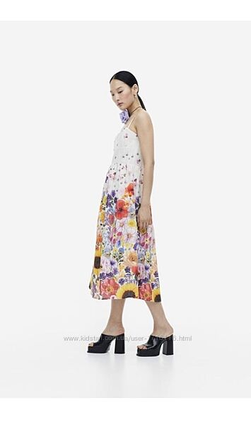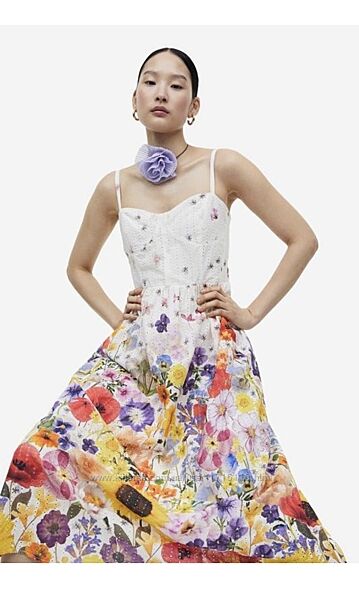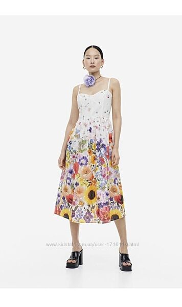 Обміна, повернення немає!Плаття без рукавів завдовжки до литки з бавовняної тканини з малюнком і англійською вишивкою. Топ, що облягає фігуру, із вирізом у формі серця, вузькими регульованими бретелями та чашечками заздалегідь заданої форми. Відрізна талія зі складкою, димчаста вставка ззаду та розкльошена спідниця