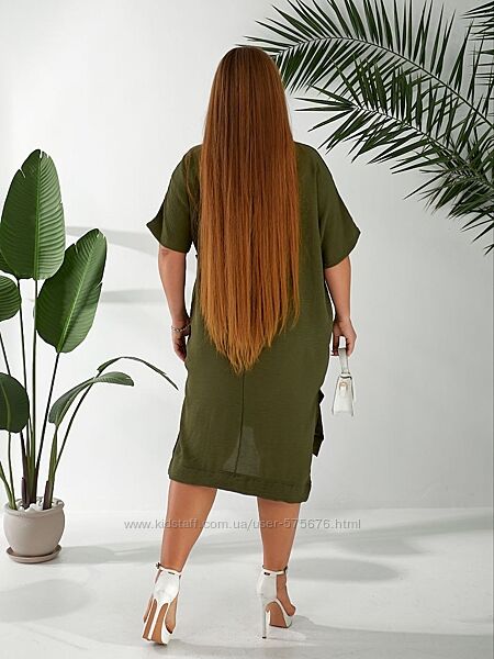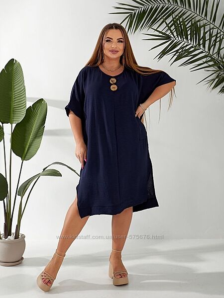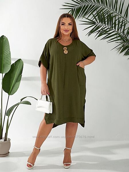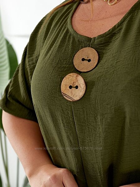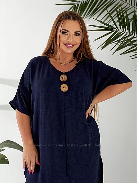 Легка і комфортна сукня виконана з приємної до тіла тканини. Вільний силует не сковує рухи і підійде для будь-якої фігури. Модель прикрашена декоративними бамбуковими ґудзиками спереду, які додають родзинку образу. Рукав короткий, спущена лінія плеча, довжина сукні - міді, трохи подовжена ззаду. Ідеально підходить для повсякденного носіння, прогулянок, відпочинку.