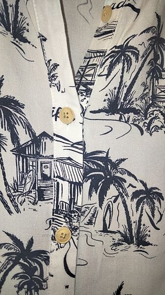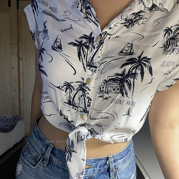 Літня крута сорочка від Bershka з коротким рукавом. Спереду на зав´язках та гудзиках. Відкладний комір. Рукав з підворотом. По спинці знизу на резинці. 100%віскоза. Розмір S. Орієнтуйтесь по замірахН/о грудь-47см