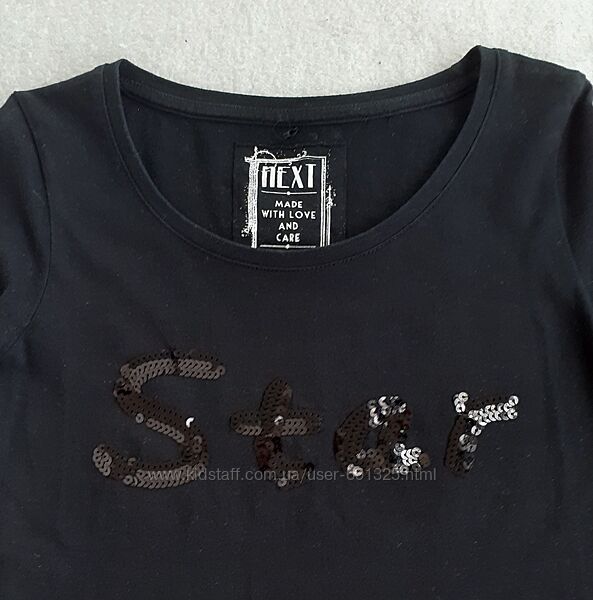 Пропоную трикотажний лонгслів, від Next. Матеріал 100% бавовна, напис STAR з паєток. Уживаний акуратно, стан дуже добрий, колір насичений, дивіться фото.Розмір вказано на 11 років, зріст 146 см. Довжина 57 см, ширина плечей 31 см, довжина рукава від