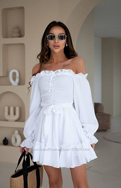 Пишна спідничка, відкриті плечики. Верх можна регулювати куліскою, по спинці та по талії є резиночка.