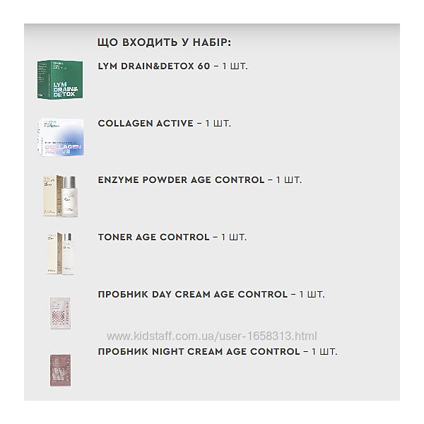 ЩО ВХОДИТЬ У НАБІР: LYM drain&detox 60 – 1 шт. COLLAGEN ACTIVE – 1 шт. Enzyme Powder Age Control – 1 шт. Toner Age Control – 1 шт. Пробник Day Cream Age Control – 1 шт. Пробник Night Cream Age Control – 1 шт. Прайс-лист оптово-роздрібний – 1 шт. + промоматеріали