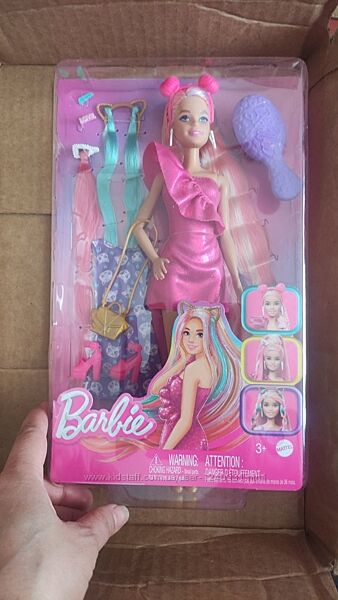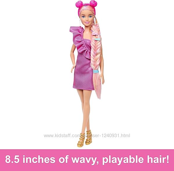 Присвячена всьому, що стосується волосся, колекція Barbie Fun & Fancy Hair представляє гламурних ляльок з яскравими зачісками. Крім того, 10 елементів одягу та стилю, що входять до комплекту, дозволяють безмежно багато можливостей для персоналізації!Лялька Барбі має 21 см надзвичайно довгого грайливого білявого волосся з фантастичними кольоровими вкрапленнями! Вона носить блискучу рожеву міні-сукню з білими сережками та золотисті туфлі на ремінцях.
