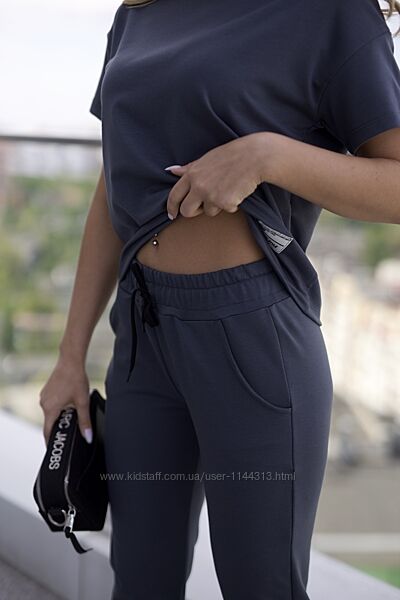 Футболка — вільного крою, що не обмежує рухів, з неглибоким округлим вирізом горловини. Особливого шарму додає стильна накатка з написом, яка акцентує увагу на сучасному дизайні.Штани — зручні, з поясом на резинці, що додатково фіксується шнурком для ідеальної посадки по фігурі. Мають дві функціональні кишені, що додають практичності. Штанини вільного крою, зібрані внизу на манжети, що забезпечує зручність та акуратний вигляд.