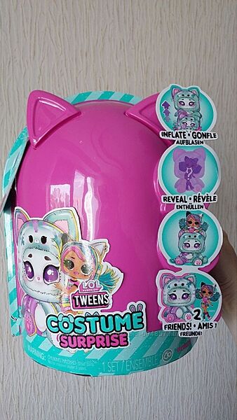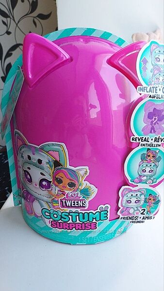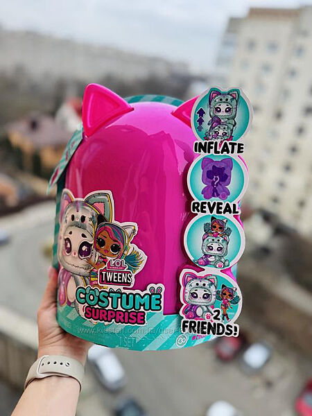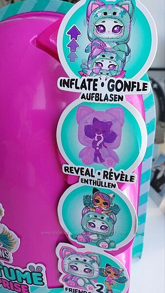 Ігровий набір з лялькою L.O.L. і надувним костюмом.Спочатку розпакуйте іграшку, зніміть обгортку, увімкніть вентилятор. Спостерігайте, як надувається чарівний костюм блакитного кошеняти. Розстебніть липучку на потилиці костюма, щоб знайти ляльку Емму Емо. Перемикач на костюмі дає змогу надувати його знову і знову.
