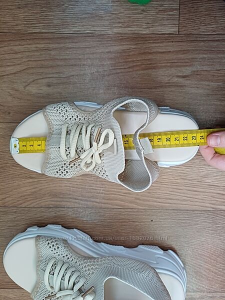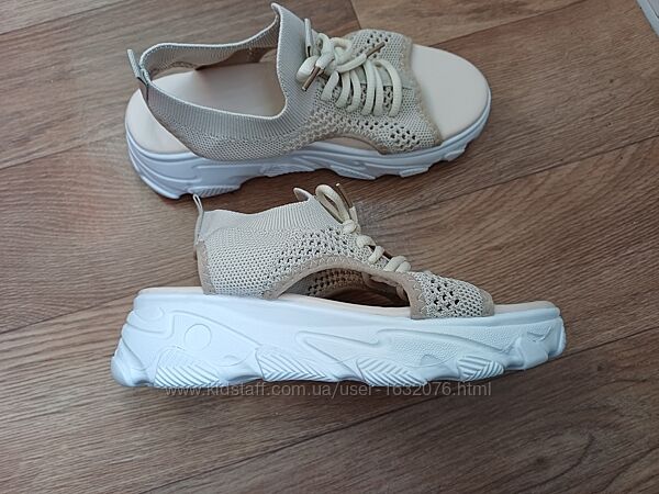 Продам нові жіночі текстильні сандалі зі шнурками. Китай, бежевого кольору, розмір 37, на платформі. Заміри на фото. На широку стопу. Продаю, бо не підійшов розмір.Наложки та повернення немає.