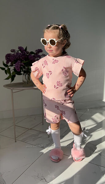 Комплект літній трикотажний в рубчік на дівчинку , що складається з шортів на резинці і принтової футболки . Колір - рожевий з фіолетовою квіткою.3-4 р( футболка ПОГ-30 см спина - 35 см шорти талія - 22 см довжина - 28см)