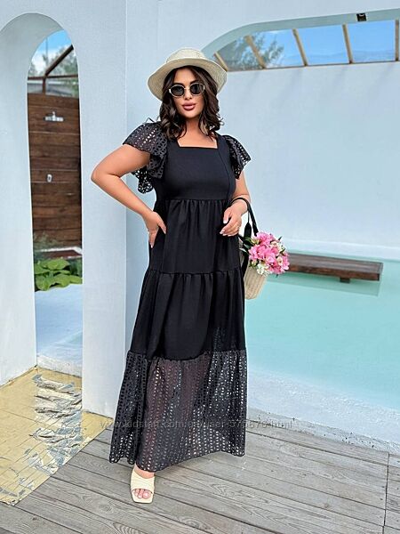 Стильна літня сукня. Сукня максі-довжини, вільного крою з завищеною талією. Верх має квадратний виріз і короткі рукави-ліхтарики з перфорованої тканини.