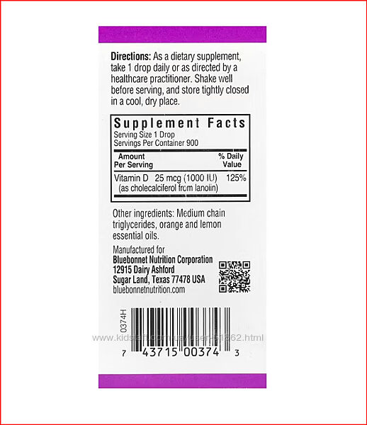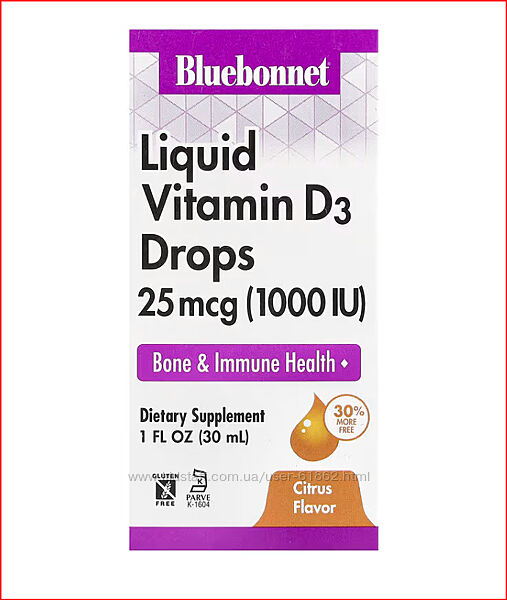 Рідкі краплі вітаміну D3 Bluebonnet Nutrition 25 мкг (1000 МО)1 крапля = 1000МЕ, всього 900 крапель у пляшці