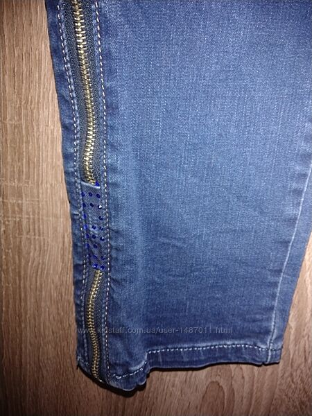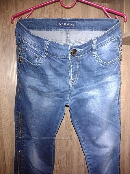Джинсы RZ. Jeans женские синие прямые. Размер 46 - 48 (W30), цвет синий. Джинсы прямые, по бокам украшены лампасами из "молний" и стразами. Линия талии - слегка занижена. Ткань: мягкая, плотная - слегка растягивается и красиво облегает.Длина 95см, окружность пояса 86см, окружность бёдер 100см, ширина штанины: на уровне бедра 25см, в самом низу 16см. Глубина посадки: спереди 22см, сзади 35см.