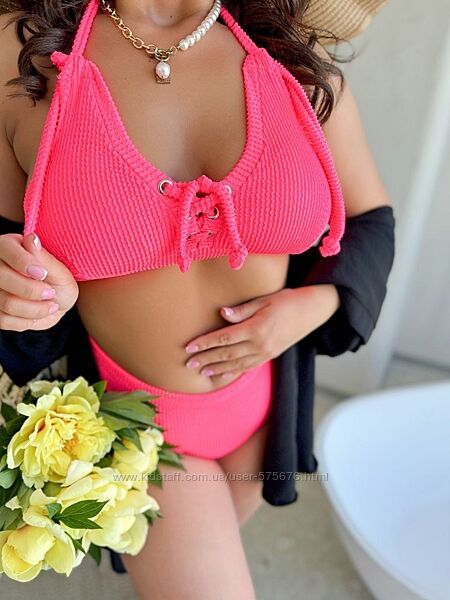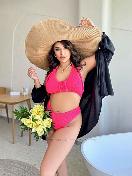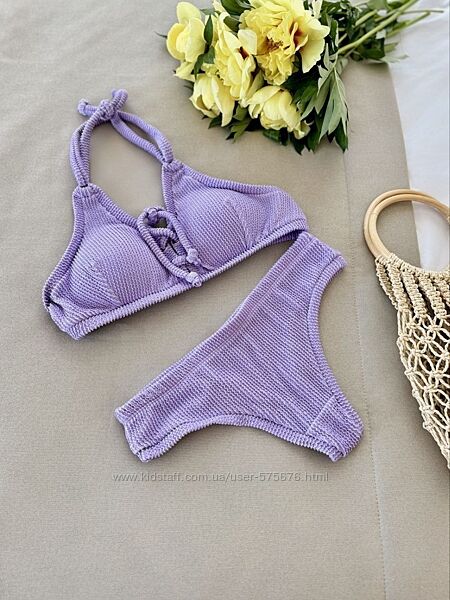 Купальник роздільний. ліф із зав´язками попереду, підклад масло, зі вставною чашкою, ззаду на зав´язках та зав´язі за шию. Плавки стрінг Бразилії, підклад масло. Тканина високої якості, дуже еластична, швидко висихає.Колір Фіолетовий, Чорний, Корал.