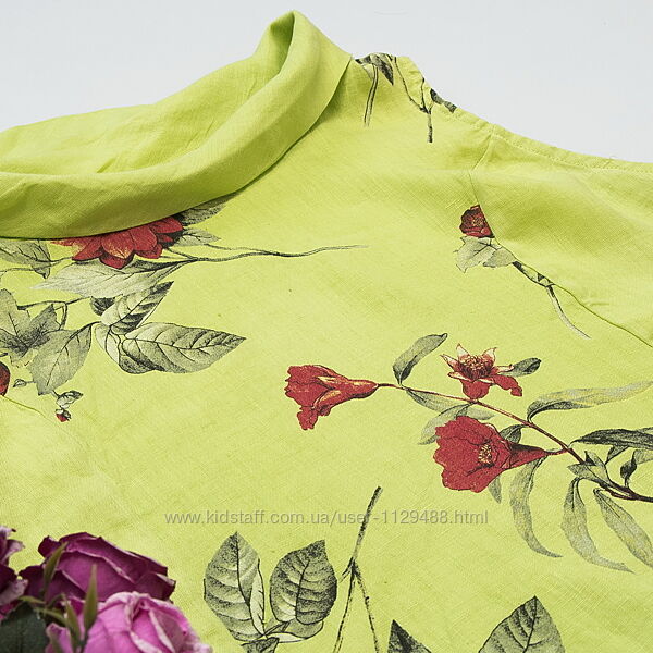 Приятного насыщенного сочного свежего лаймового цвета с милейшим цветочным принтом, выполнена из натуральной дышащей ткани, очень приятная к телу, не жаркая. Крой свободный, в спинке по бокам трикотажные вставки, по талии регулируется пояском, кому не надо, можно отрезать). Модель универсальная, легко вписывается в гардероб, сочетается с любым низом, отлично подходит для создания стильных многослойных образов.