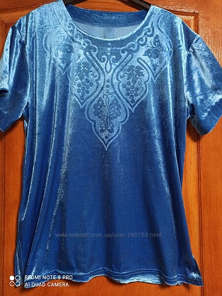 Гарна блузка, стан нової, тканина велюр, без дефектів. Плече 15 см, рукав 20 см, ПІГ 60 см-- тягн. до 70 см, внизу 60 см, по бокам є маленькі розрізи., довжина від плеча 71 см.Бірок немає. Будь ласка, заміри для вас.