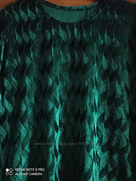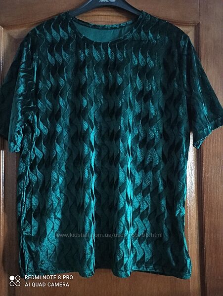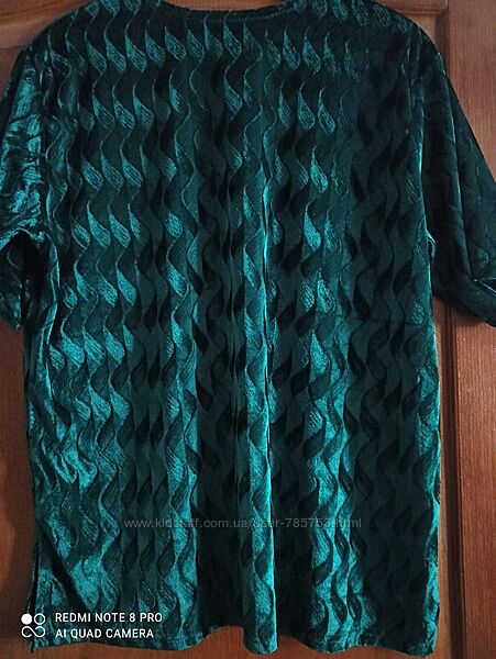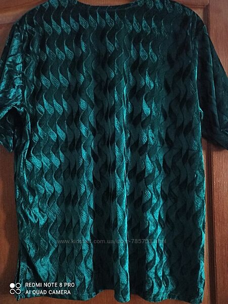 Гарна блузка, стан нової, тканина велюр, без дефектів. Не вдалося передать колір, гарний зелений колір.Плече 14 см, рукав 26 см, ПІГ 60 см-- тягн. до 70 см, внизу 60 см, по бокам є маленькі розрізи., довжина від плеча 69 см.