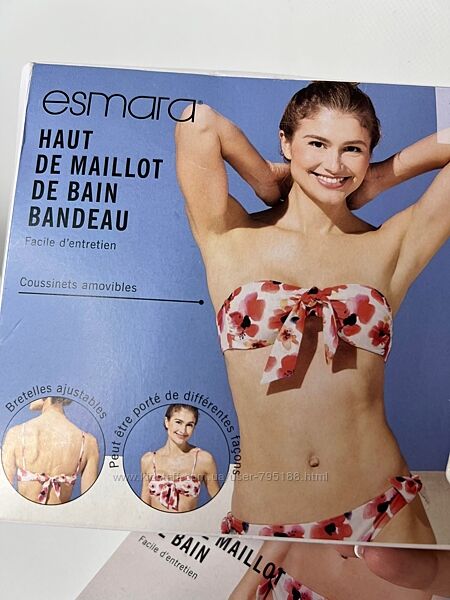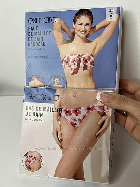 Купальник роздільний від німецького бренду EsmaraРоздільний купальник на зав´язках, еластична тканина на підкладці, сформована чашка на тонкому поролоні, бретельки знімні, на ліфті по краю селікон