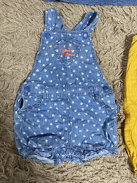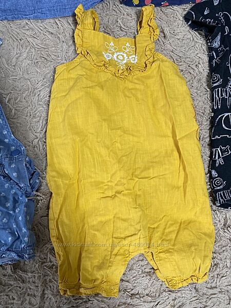 Все в чудовому стані на вік 9-12 місяців: туніка з пепою, легке плаття з яблуками від НМ, чорний ромпер, легкий ромпер жовтого кольору, шлейки регулюються, джинсовий комбінезон міні маус та панамка на резинці в подарунок. Ціна за все 200 грн