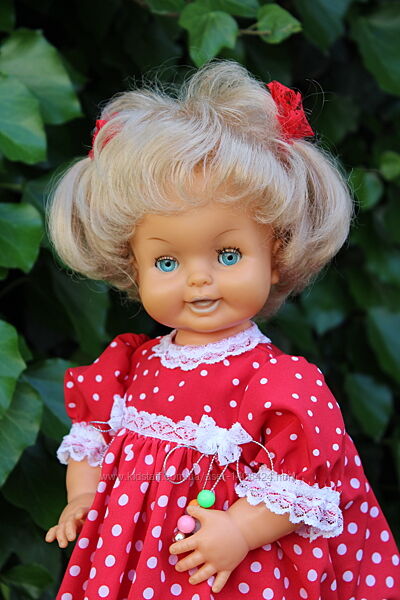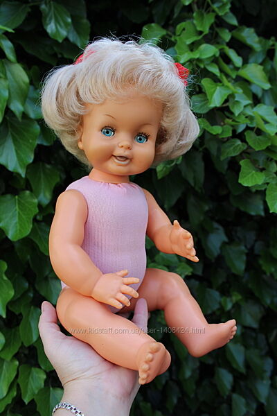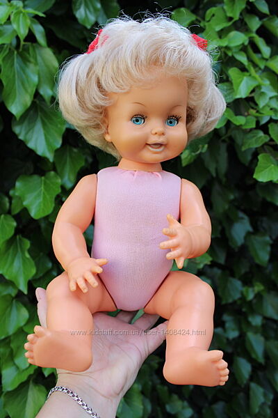 Очень позитивная малышка фирмы Bella- Франция. Кукла с чудесными глазами. Голова, руки, ноги из винила.Тело текстильное, очень необычное. Все целое, порисовок и повреждений нет.