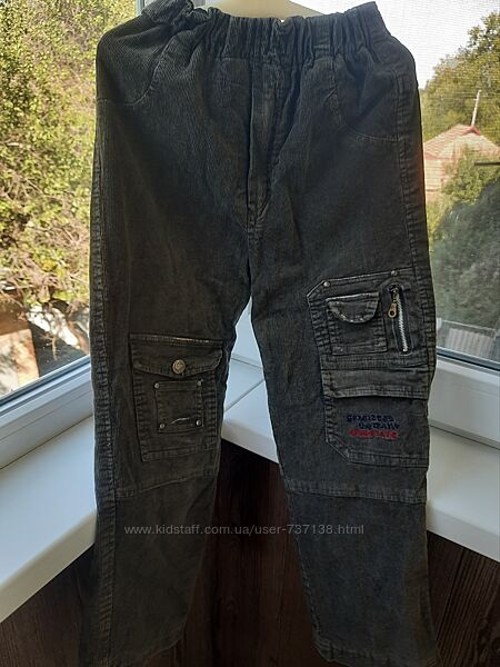 (Фото 5-7) вельветові теплі штани на флісі, вік 7-9 років. Пояс - резинка. Трохи потерті кармани, невбиваємі, міцні, зручні. Завжди стануть в нагоді для хлопчика. Заміри: довжина 74 см, ПОТ 23 см (резинка тягнеться до 33), шаговий 49 см.
