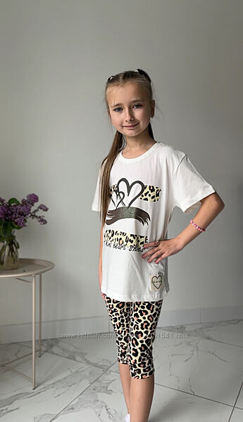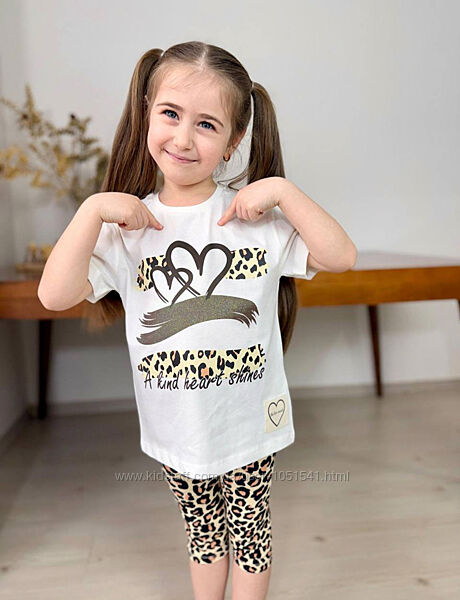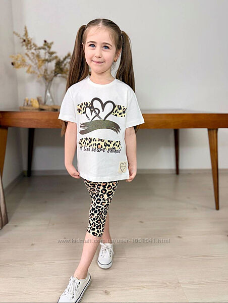 Трикотажні котонові комплекти з принтом леопард сердечка -футболочка і полулосіни .Відмінна якістьВІК 3 -4(футболка ПОГ-34 см спина - 42 см лосіни талія - 22 см довжина - 43 см шаг -25 см )