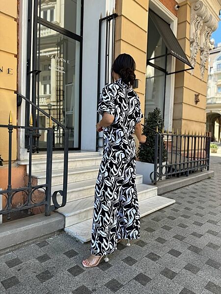 Костюм прогулянковий . Штани прямого крою, попереду зроблена стрічка, на резинці, висока посадка. Рубашка з розрізами по боках, спущений рукав.