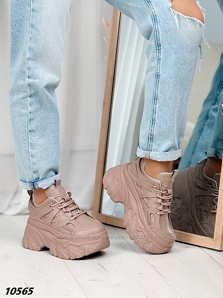 Кросівки Матеріал еко-шкіра Матеріал підошви: Піна Колір DARK KHAKI На шнурівці Висота від п´яти 6 см Висота підошви позаду 8 см, попереду 6 см