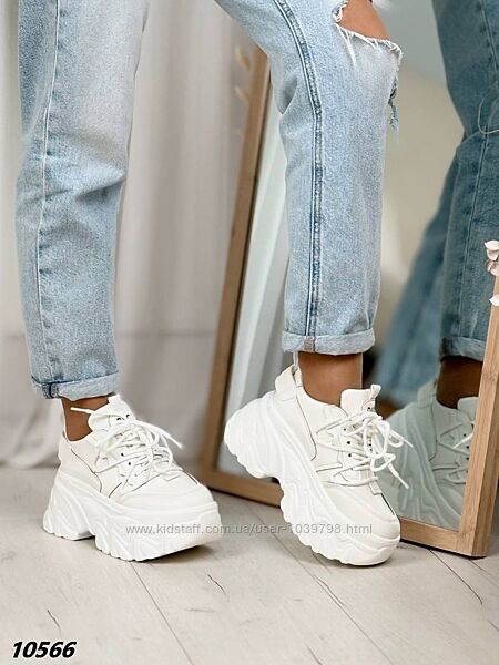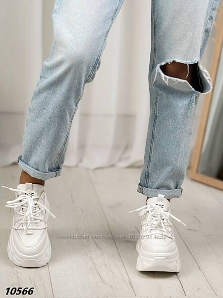 Кросівки Матеріал еко-шкіра Матеріал підошви: Піна Колір білий На шнурівці Висота від п´яти 6 см Висота підошви позаду 8 см, попереду 6 см