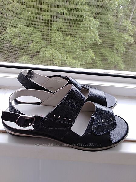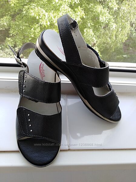 Удобные кожаные босоножки Medicus.Изготовлены из натуральной кожи, внутри натуральная кожа, босоножки на липучках.Размер 5 1/2, стелька 25, ширина 8см.,танкетка в районе каблука 3,5см.