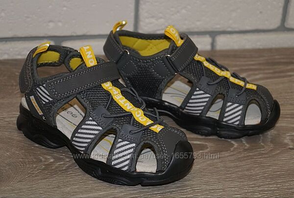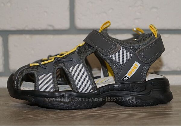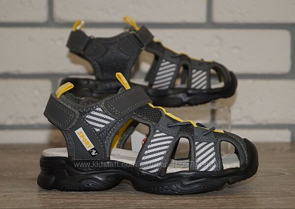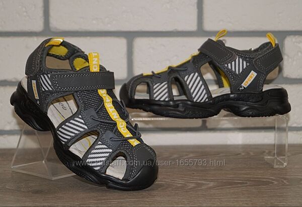 Стильна новинка! Брендові сандалії для хлопчика в сірому кольорі. Якісна, легка та зручна модель для активного щоденного носіння.Пошиті в комбінації штучної шкіри високої якості та текстилю. Налічують багато вентиляційних отворів, завдяки чому мають підвищену циркуляцію повітря, що запобігає запотіванню ніжок. Усередині текстильна підкладка. Закритий носок захищає пальці ніг від ударів і травм. Шкіряна устілка із супінатором. Застібаються на два зручних ремінця на липучці та доповнені еластичними шнурками. Підійдуть на ніжку будь-якої повноти та підйому. Легкі та гнучкі – не обмежують рухів.